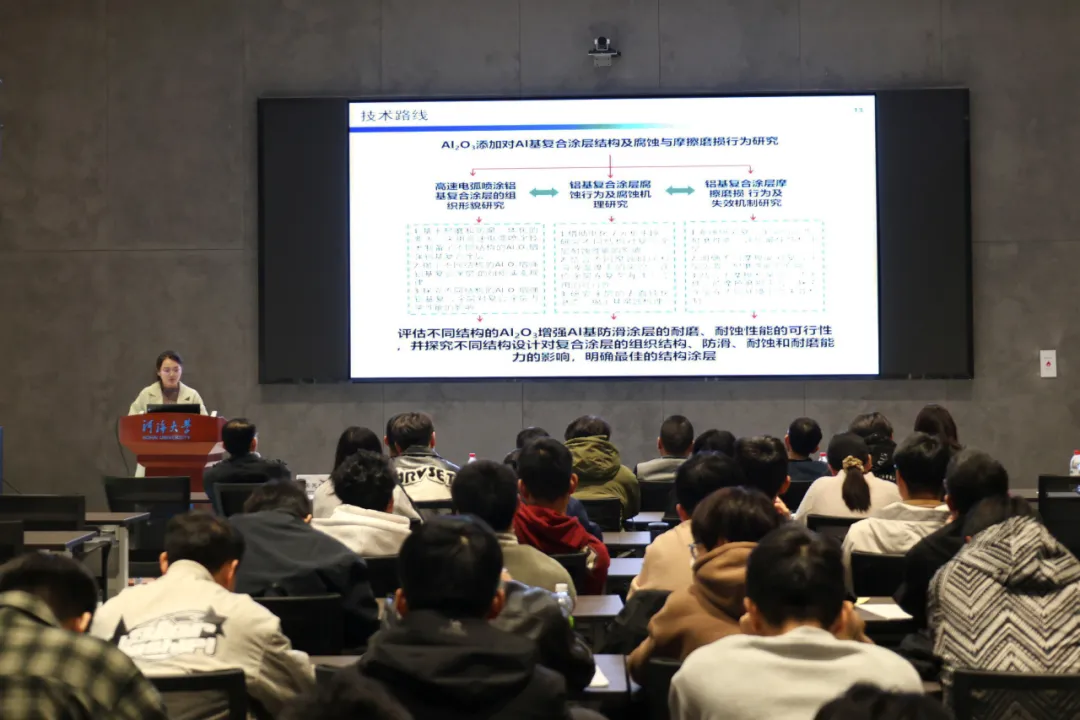 23级硕士研究生许潇,以“高速电弧喷涂不同结构铝基复合涂层组织及腐蚀与摩擦磨损行为研究”为主题,介绍了涂层保护目前的优缺点,同时介绍了激光熔覆技术与其他技术相比的明显优势。分享了铝基复合涂层腐蚀与磨损行为的实验探求路线,展示了目前的研究工作与成果,为大家在腐蚀保护方向提供了新见解。