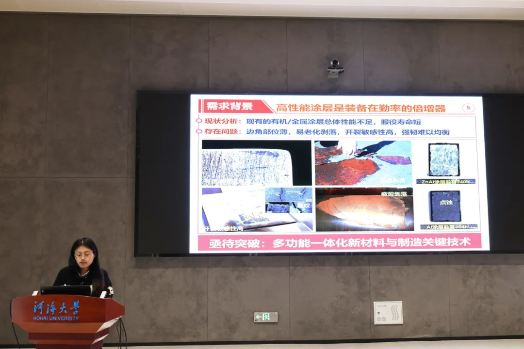 23级硕士研究生许潇,以“高速电弧喷涂不同结构铝基复合涂层组织及腐蚀与摩擦磨损行为研究”为主题,介绍了涂层保护目前的优缺点,同时介绍了激光熔覆技术与其他技术相比的明显优势。分享了铝基复合涂层腐蚀与磨损行为的实验探求路线,展示了目前的研究工作与成果,为大家在腐蚀保护方向提供了新见解。