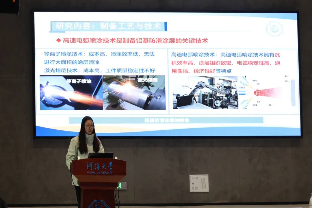 23级硕士研究生葛姝含就其汇报主题“陶瓷种类和粒度对高速电弧喷涂Al基复合涂层组织及腐蚀与摩擦磨损行为影响”与大家进行了交流。汇报指出高速电弧喷涂技术是制备金属基防滑涂层的关键技术,添加哪些强韧材料是提高涂层性能目前趋势,提供了提高涂层性能的独特思路。