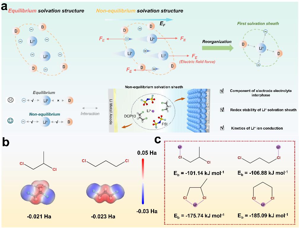 图1:(a) 在外部电场作用下,从平衡态溶剂化结构到非平衡态溶剂化结构的转变示意图。(b) DCP12和DCP13的分子结构和静电势图。(c) 不同构型的Li+离子与DCP12和DCP13的结合能强弱。