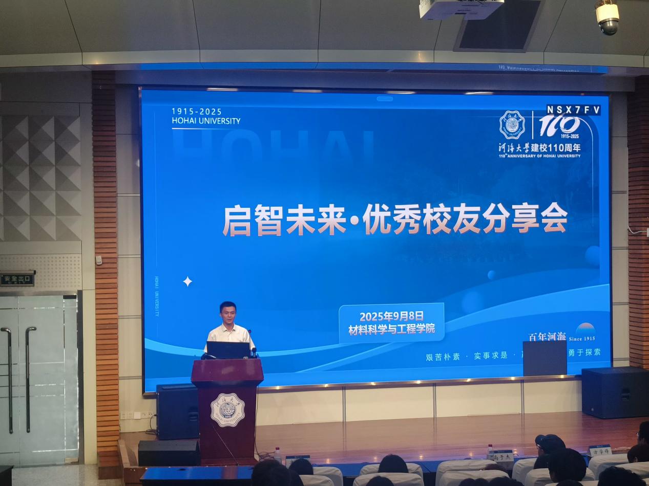 随后,江苏省“六大人才高峰”高层次人才培养对象、正高级工程师、南京市锅炉压力容器检验研究院副院长方学峰校友登台分享。他首先从宏观角度阐述了材料科学在现代工业体系中的核心地位与广泛应用,涵盖能源、交通、航空航天等多个国家战略领域。接着,他回顾了自己从河海求学到投身特种设备检验行业的奋斗历程,分享了参与20余项国家级、省部级科研项目的宝贵经验。最后,他结合自身成长,为新生提出三点学习建议:一是夯实专业基础,二是注重实践能力,三是保持终身学习。他勉励同学们:“材料是工业的基石,你们是未来的基石——唯有脚踏实地,方能顶天立地。”